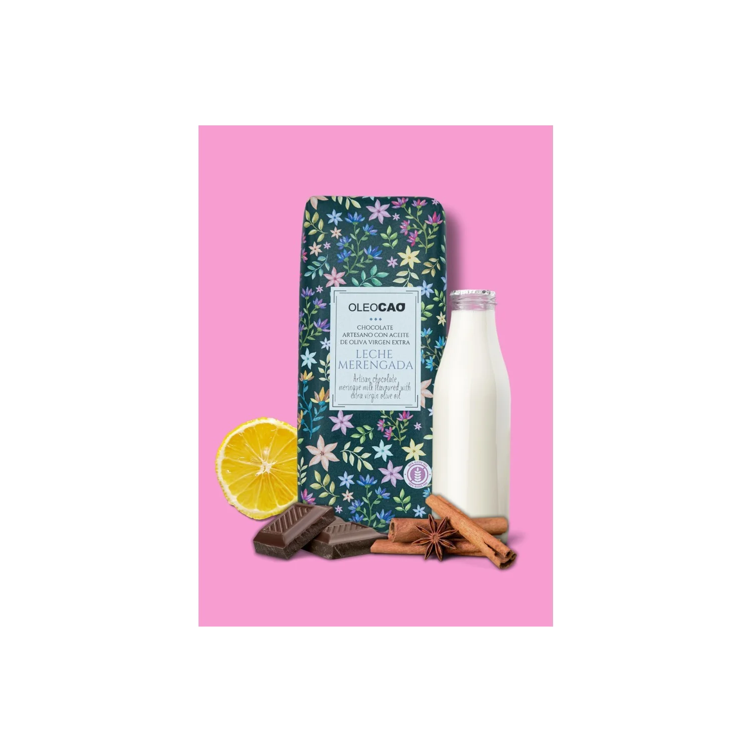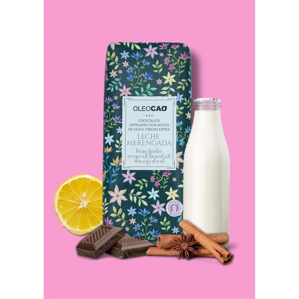 Artisan dark chocolate with EVOO filled with meringue milk cream, 115 gr. Box 3 units.