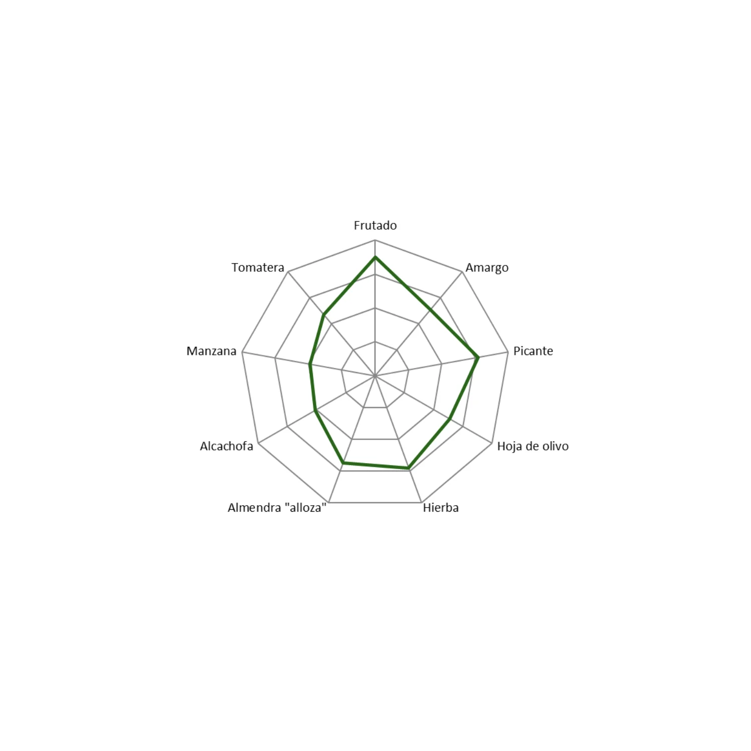 Green olive intense fruity, clean and fragrant. Base note of grass-green flavors, artichoke and almond, mixed with the perfume of fresh green olive fruit, followed by apple and banana fruity notes.