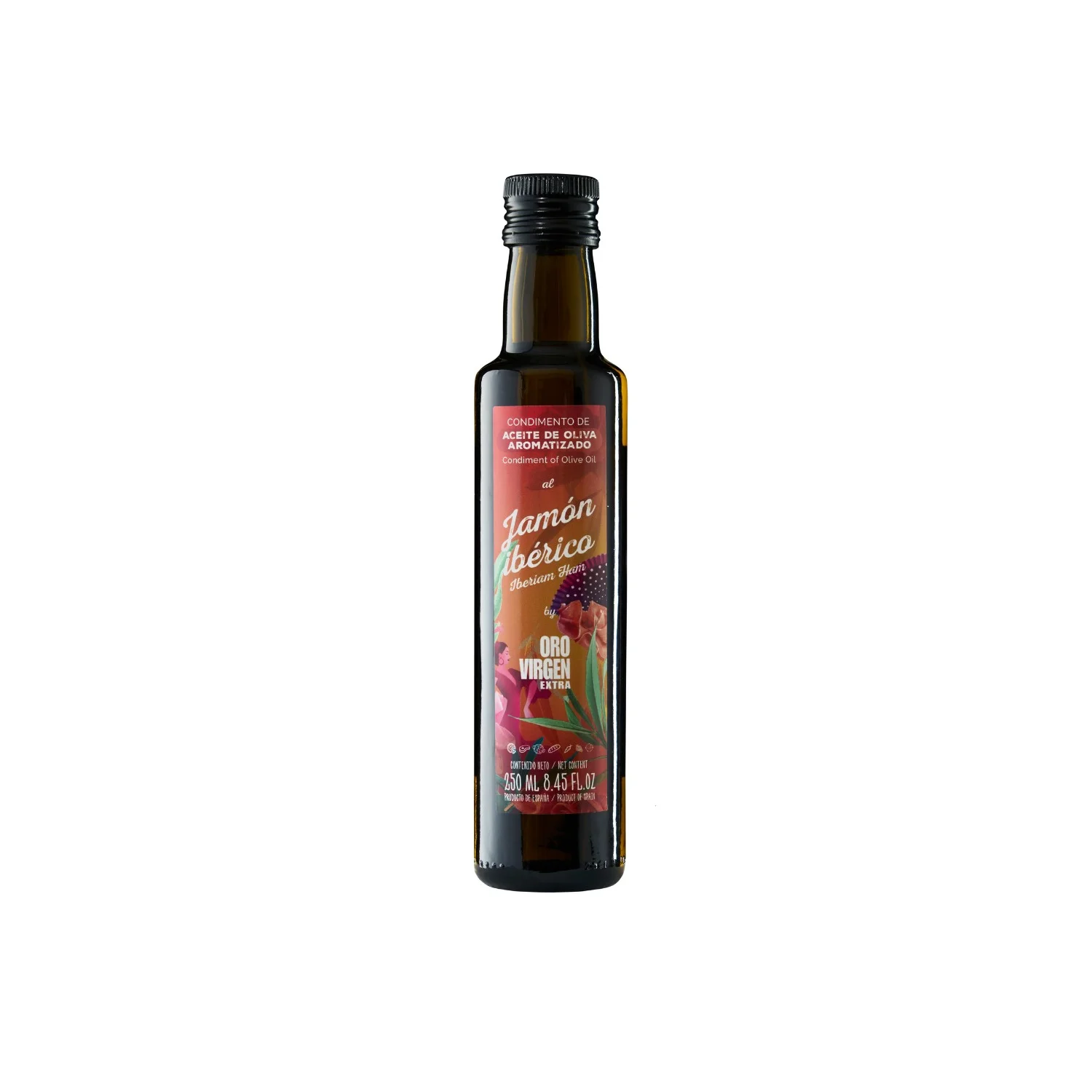 Oro Virgen Extra Aromatizado con Jamón Ibérico es un Condimento preparado a base de Aceite de Oliva Virgen Extra y esencia de Jamón Ibérico