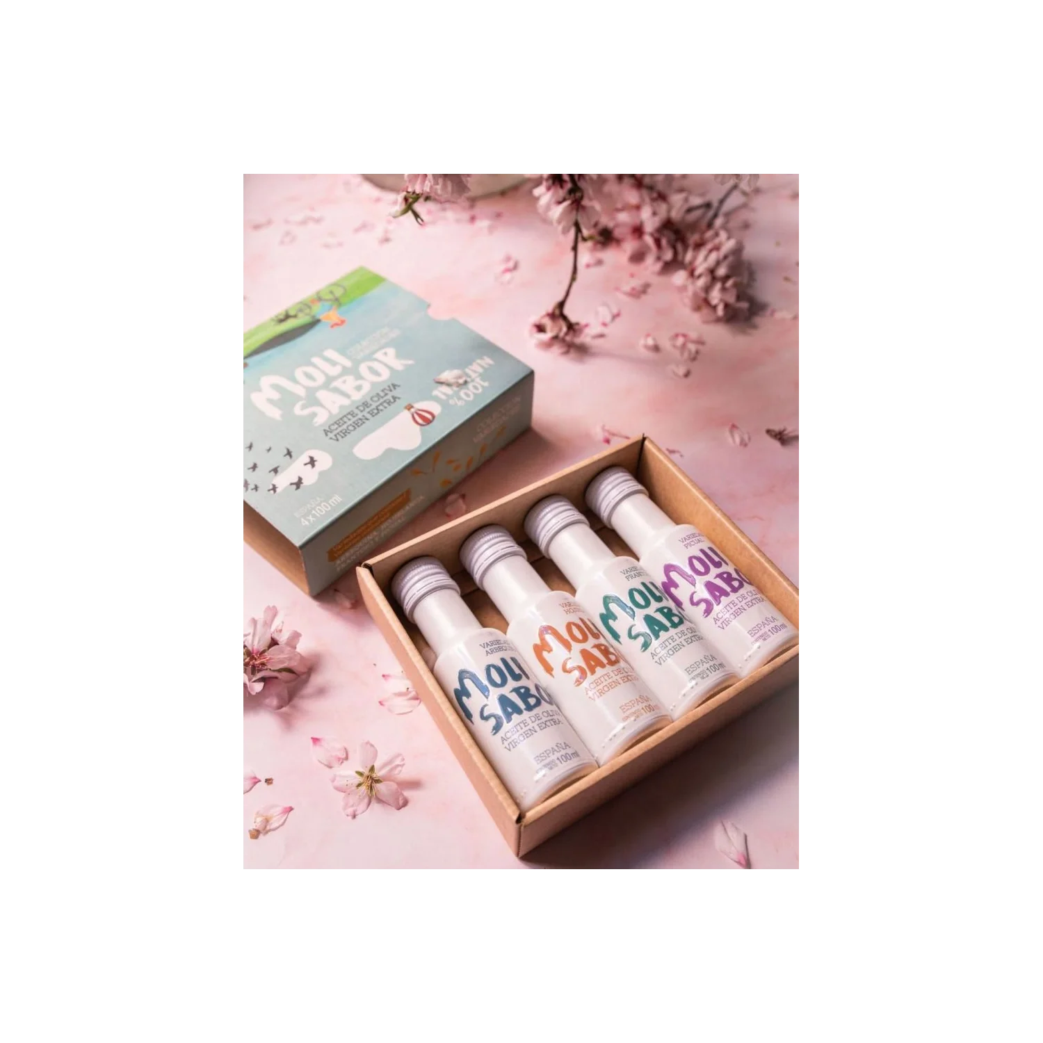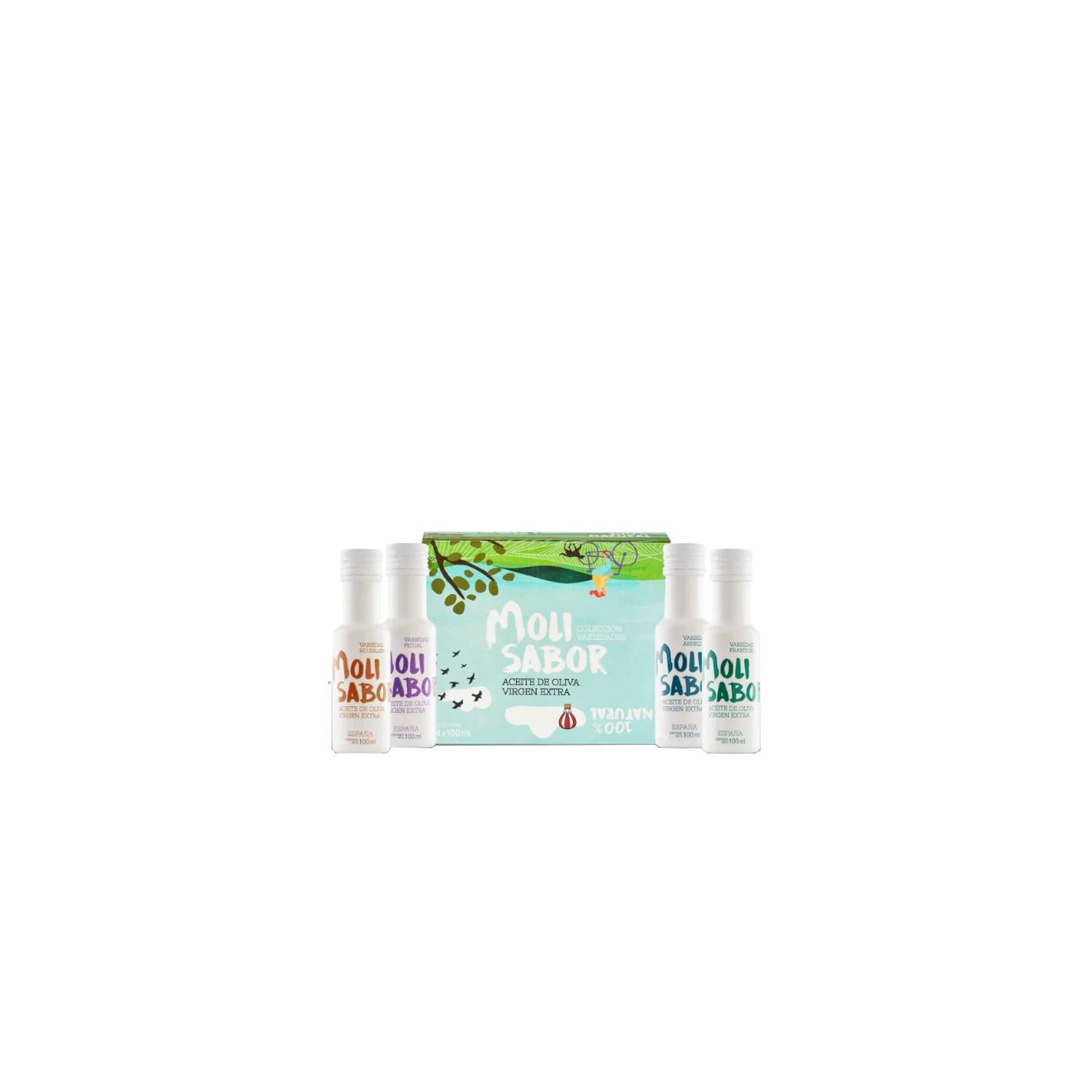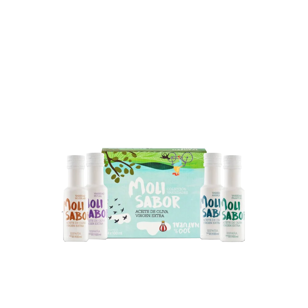 El pack contiene una botella de cada variedad Molisabor: Arbequina, Hojiblanca, Picual, y Frantoio.
