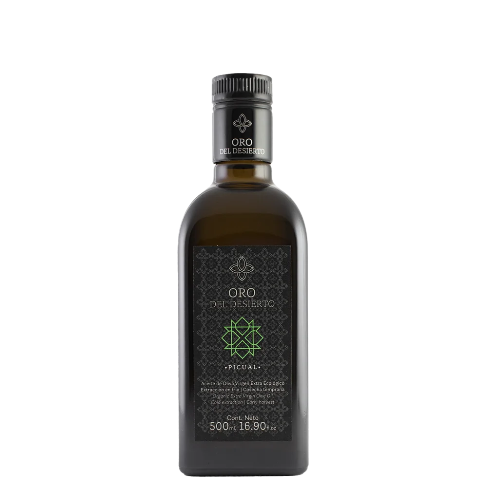 Aceite de oliva virgen extra ecológico de producción limitada, procedente exclusivamente de aceitunas picuales cosechadas en envero temprano en la finca “el vicario” propiedad de la empresa.