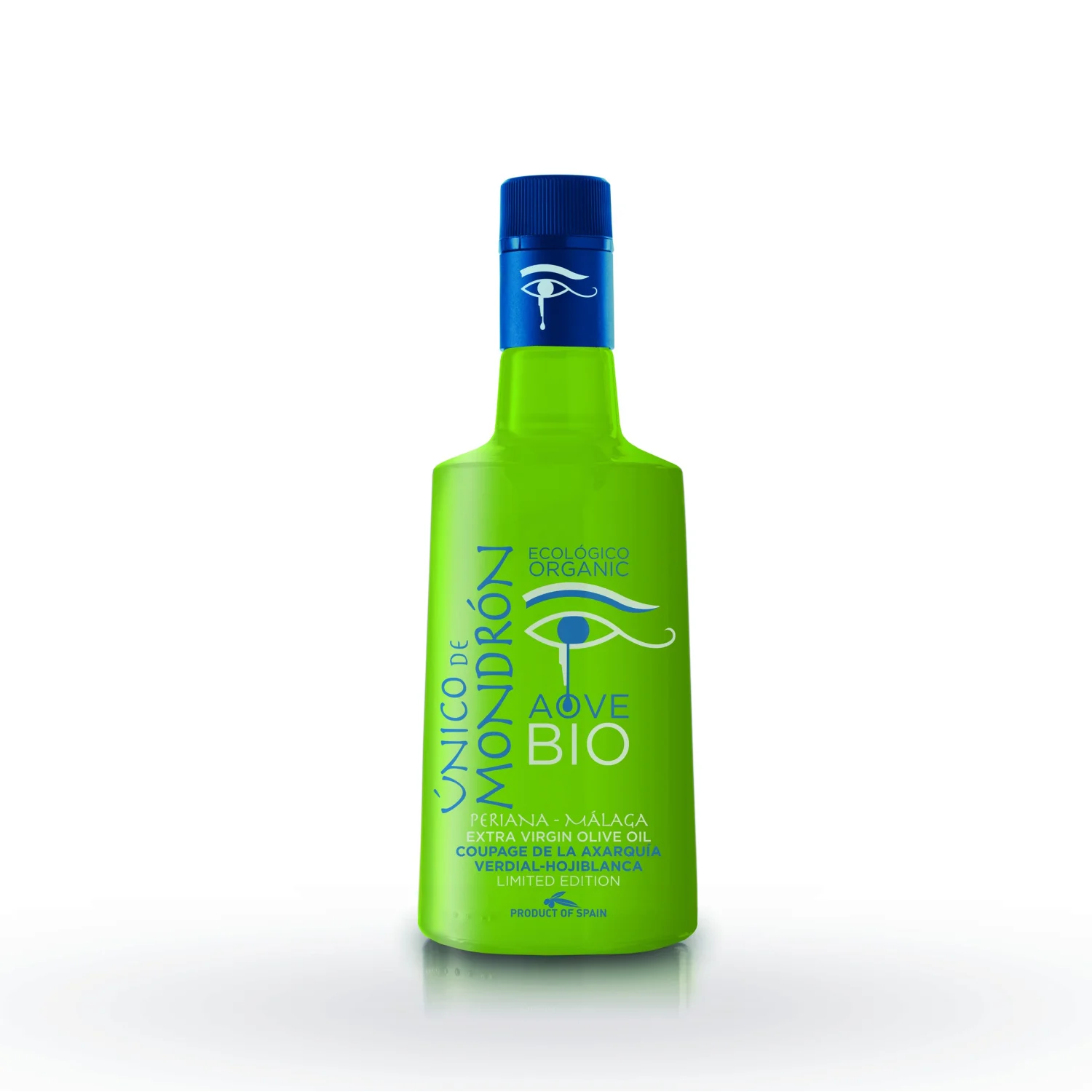 Único de Mondrón Bio es un aceite virgen extra ecológico coupage procedente de olivos de montaña de la exclusiva variedad Verdial de Vélez y la prestigiosa Hojiblanca, a partir de aceitunas recolectadas la primera semana de noviembre,