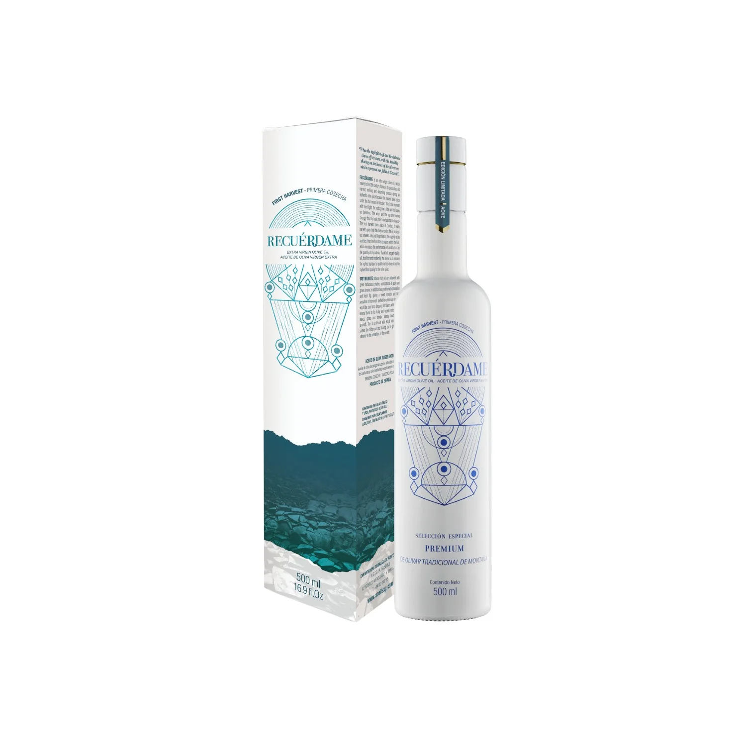 RECUERDAME, es un aceite de oliva virgen extra, que por la forma de producción viaja en el tiempo al siglo XIX por forma antigua de recolección, molturación y decantación dando un puro zumo de oliva.
