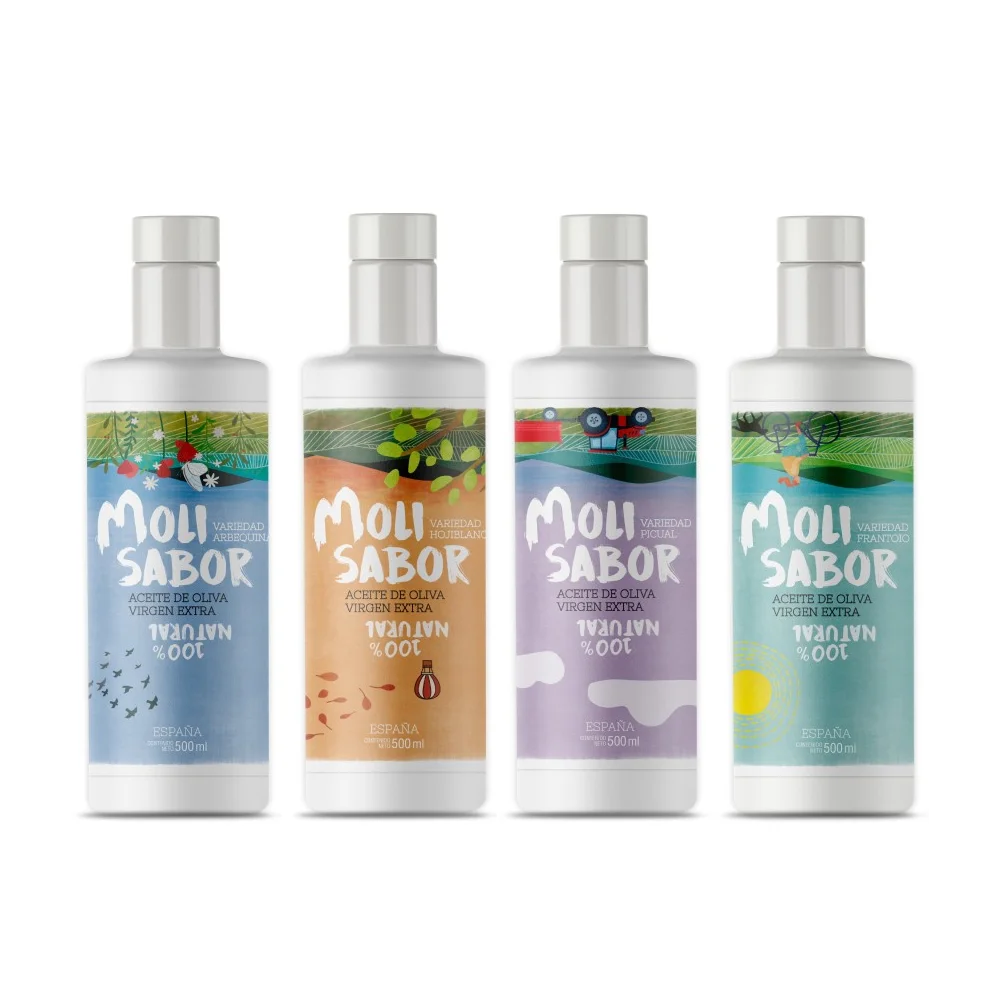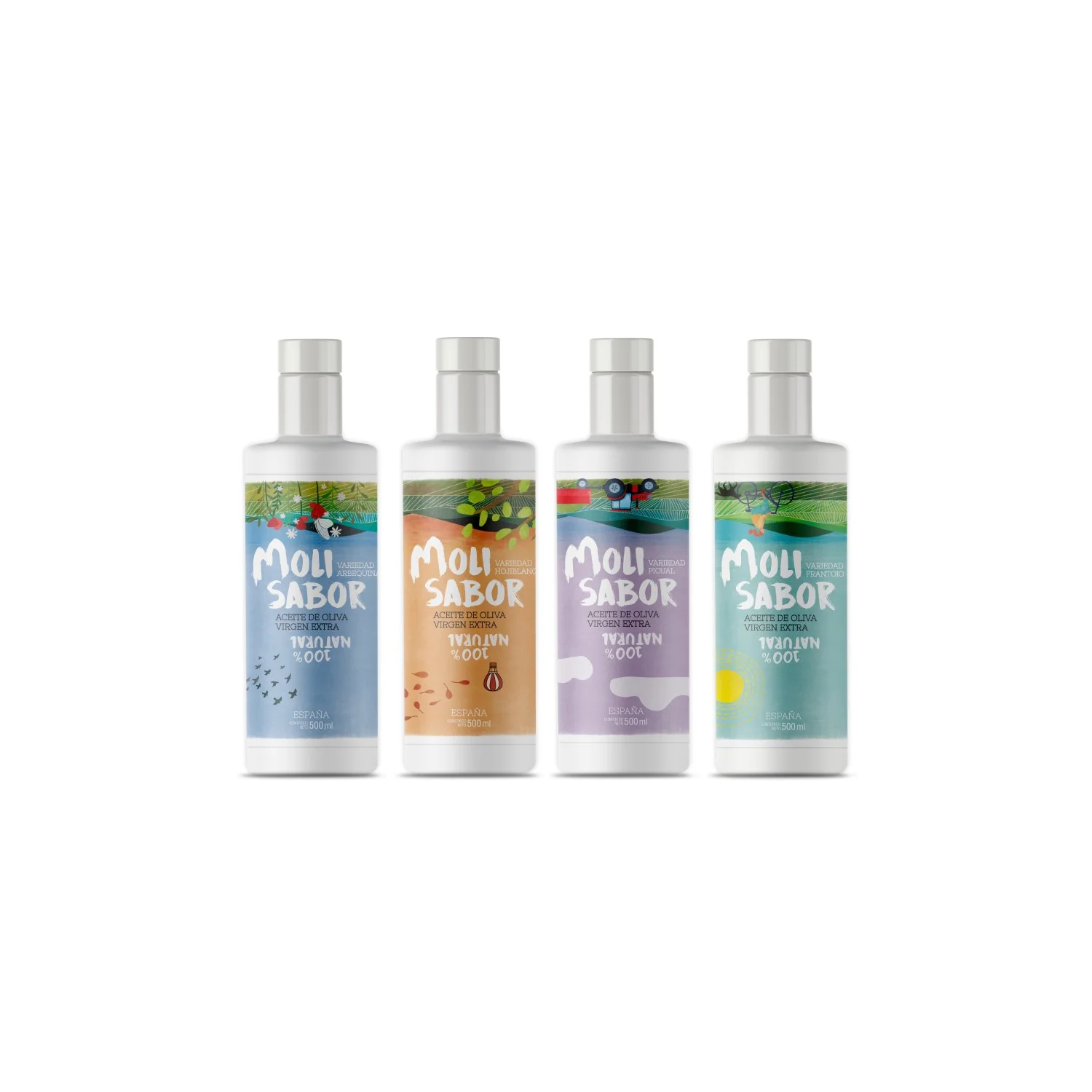 El pack contiene una botella de cada variedad Molisabor: Arbequina, Hojiblanca, Picual, y Frantoio.