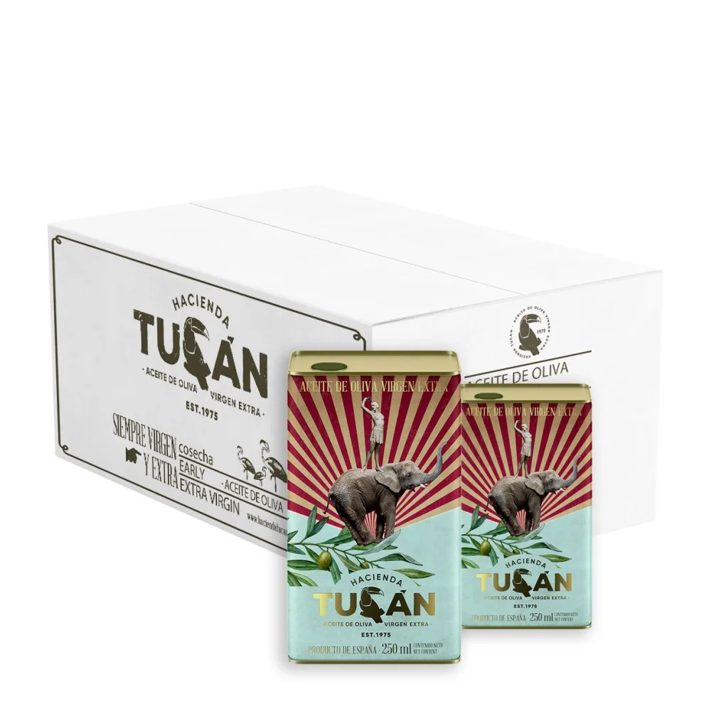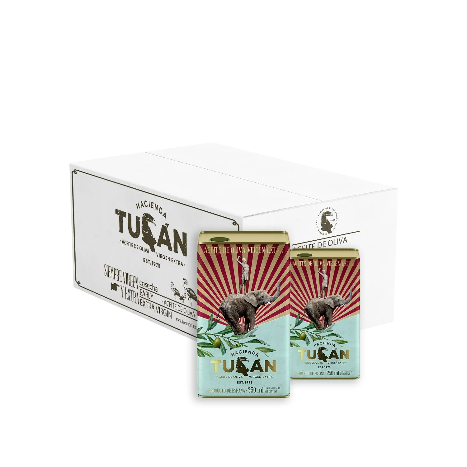 Aceite de Oliva Virgen Extra en lata de 250 ml, presentado en cajas de 12 unidades. Un envase práctico que conserva la calidad y frescura del aceite, perfecto para uso diario o para regalar.